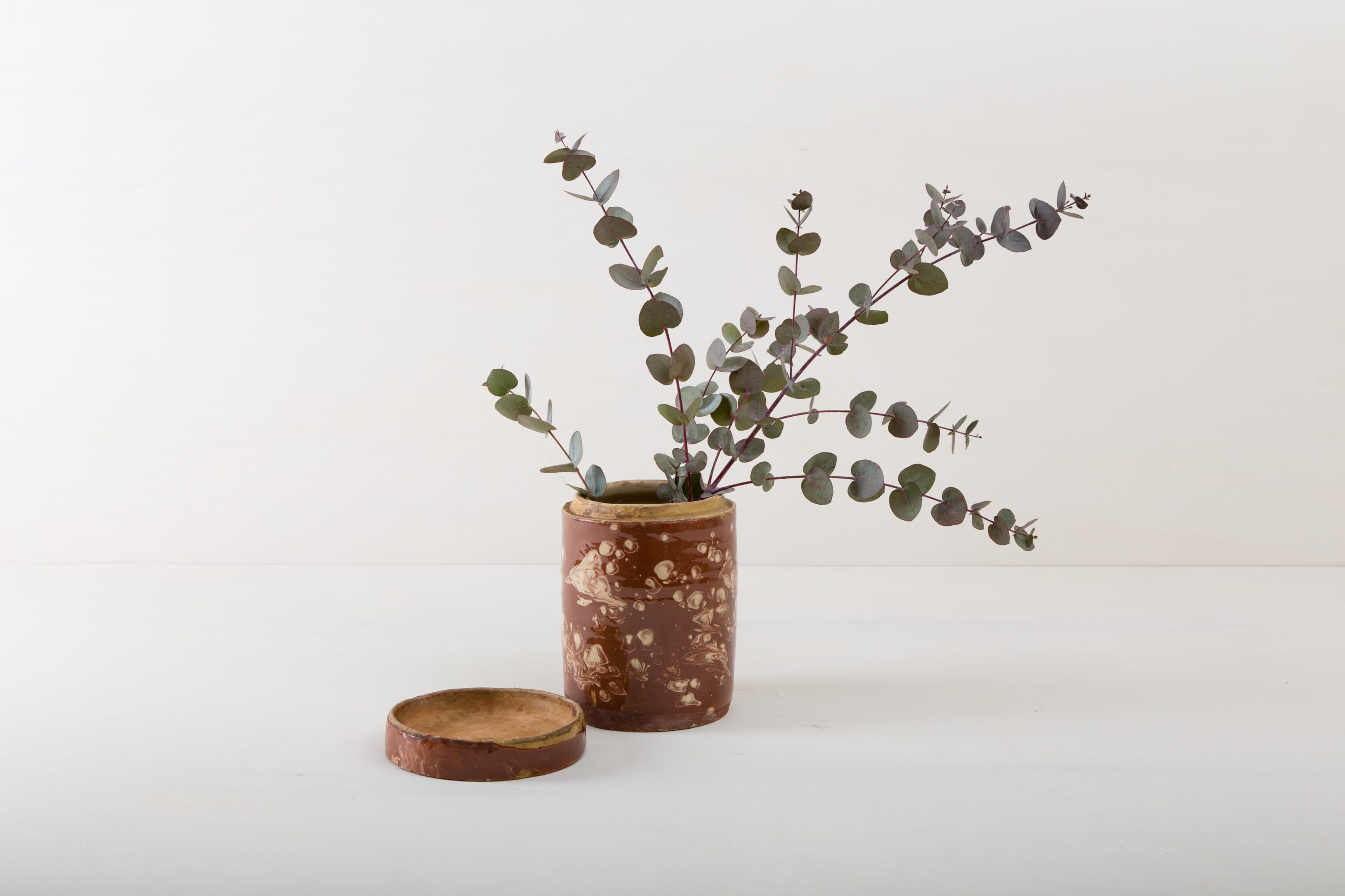 Brown marbled ceramics, the old technique of marble glaze is very popular in southern Italy. The cylindrical storage vessels date from the 1930s and were used to store antipasti or olives. Now well cleaned you can use the jars as a vase for your event styling or wedding decoration.